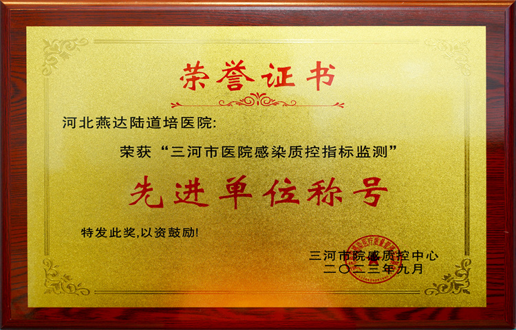 河北燕達(dá)陸道培醫(yī)院榮獲“三河市醫(yī)院感染質(zhì)控指標(biāo)監(jiān)測(cè)”先進(jìn)單位稱號(hào)。