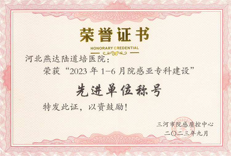 河北燕達陸道培醫(yī)院榮獲2023年1-6月院感亞??平ㄔO先進單位稱號