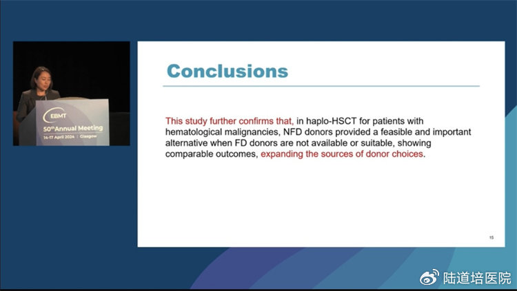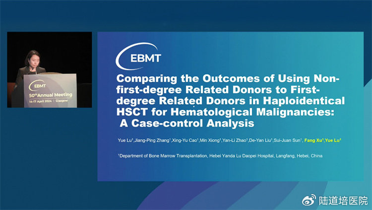 當?shù)貢r間,4月16日下午15:15,由陸道培醫(yī)院骨髓移植科胥方醫(yī)生代表盧岳主任團隊在“Optimising donor Choice”環(huán)節(jié)中,口頭匯報了“Comparing the Outcomes of Using Non-First-Degree Related Donors to First-Degree Related Donors in Haploidentical HSCT for Hematological Malignancies: A Case-Control Analysis”的臨床研究成果,研究證實了在單倍體造血干細胞移植中,采用非直系供體在療效及安全性方面均可以與直系供體相媲美,這也為臨床上擴展單倍體移植供者的可選擇范圍提供了進一步的證據(jù)支持。盧岳主任團隊這一項研究受到了頗多關(guān)注。